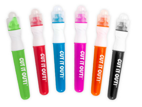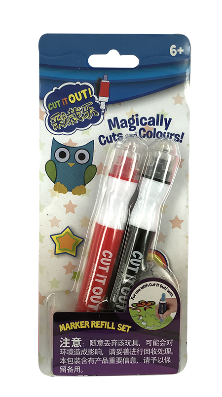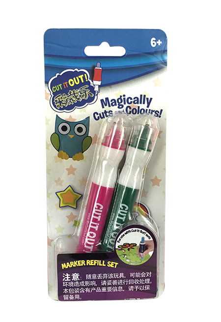 彩裁乐是一款适合小朋友自己创作图案的玩具,套上神奇笔套的马克笔,无需剪刀,涂色和裁剪图案能同时进行了! 多彩双色笔有2钟颜色,小朋友可以用马克笔制作更多的图案。